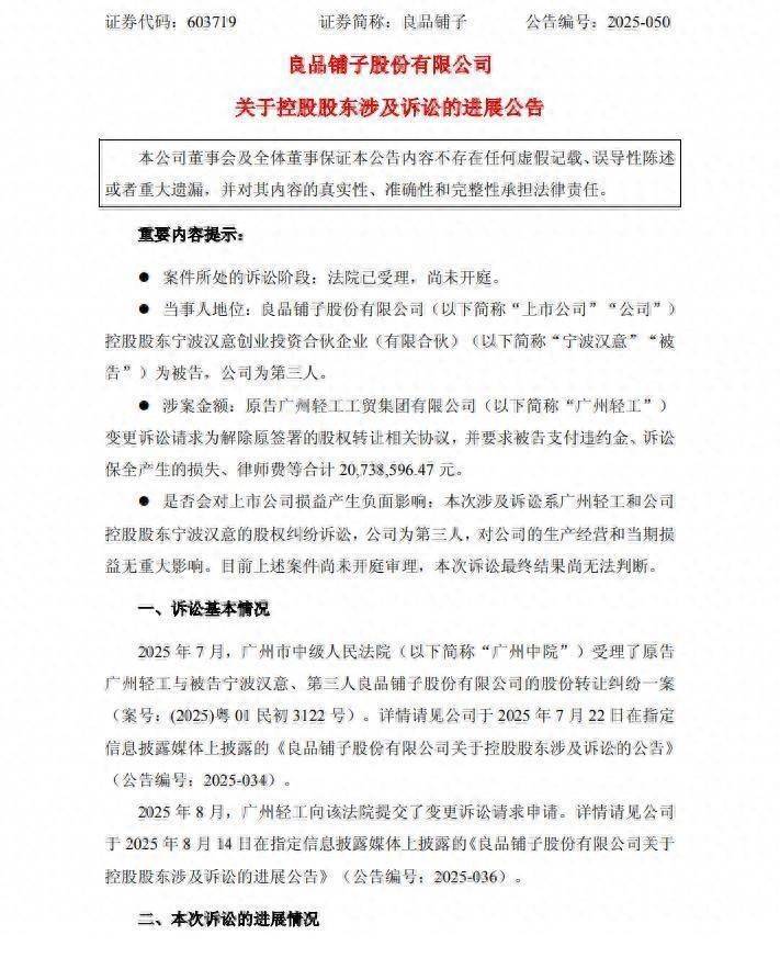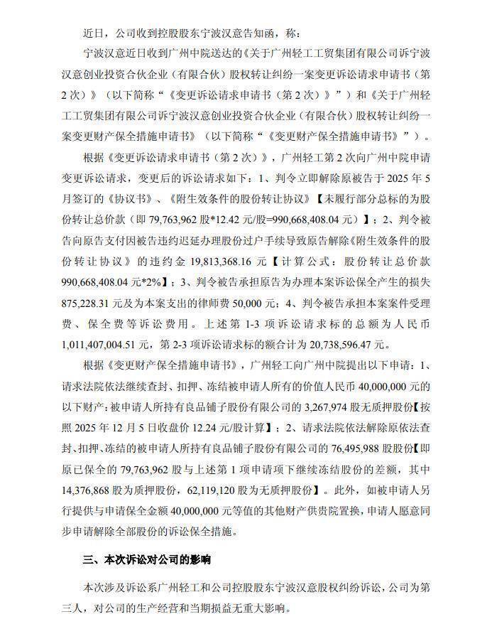 7月21日,良品铺子公告称,广州市中级东说念主民法院受理了原告广州轻工与被告宁波汉意、第三东说念主良品铺子股份有限公司的股份转让纠纷一案,涉案金额为9.96亿元。