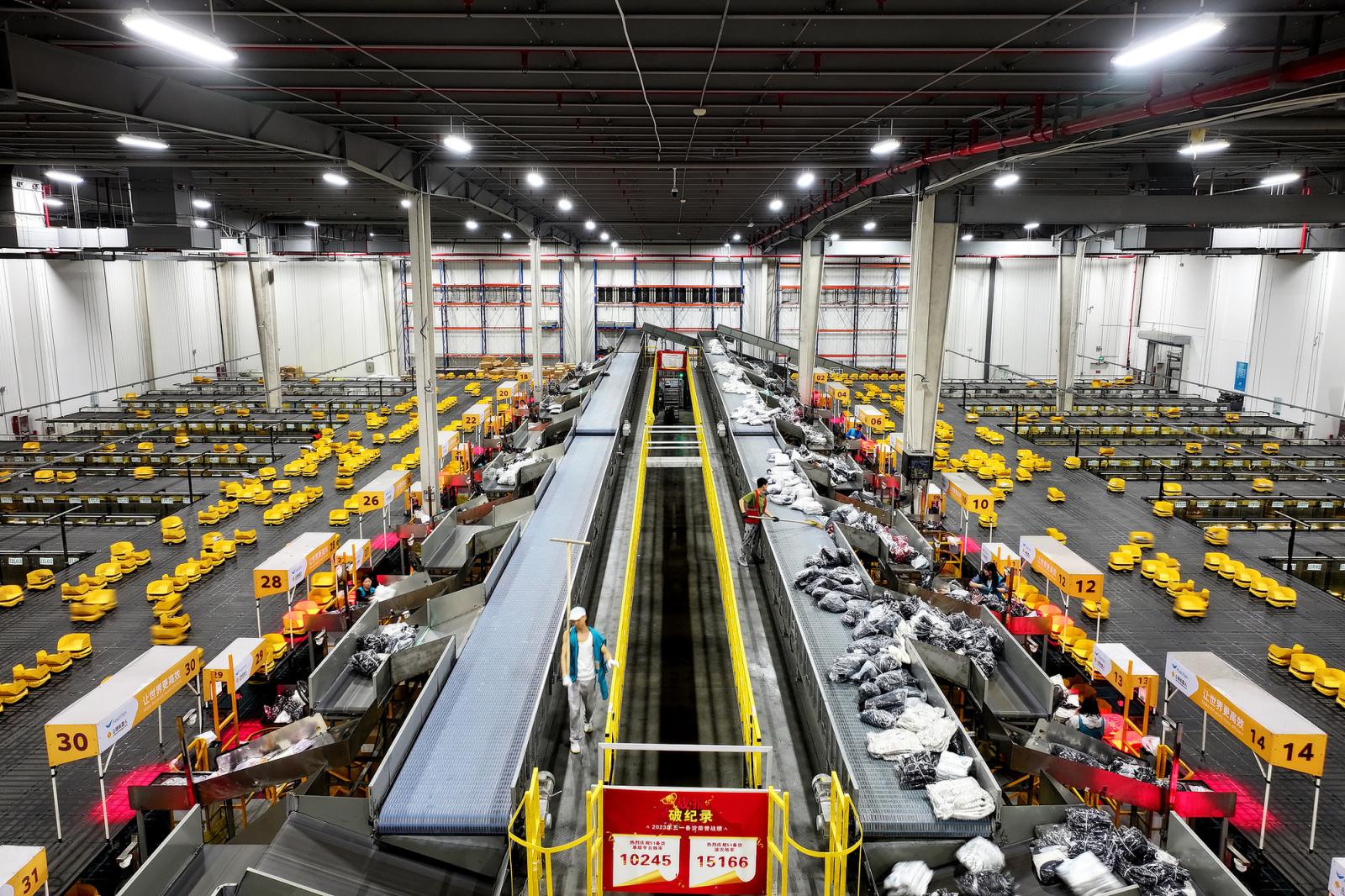 2024年11月11日晚,浙江省湖州市德清县一物流中心内,880台分拣“小黄东说念主”机器东说念主笨重着精确配送万般衣饰。