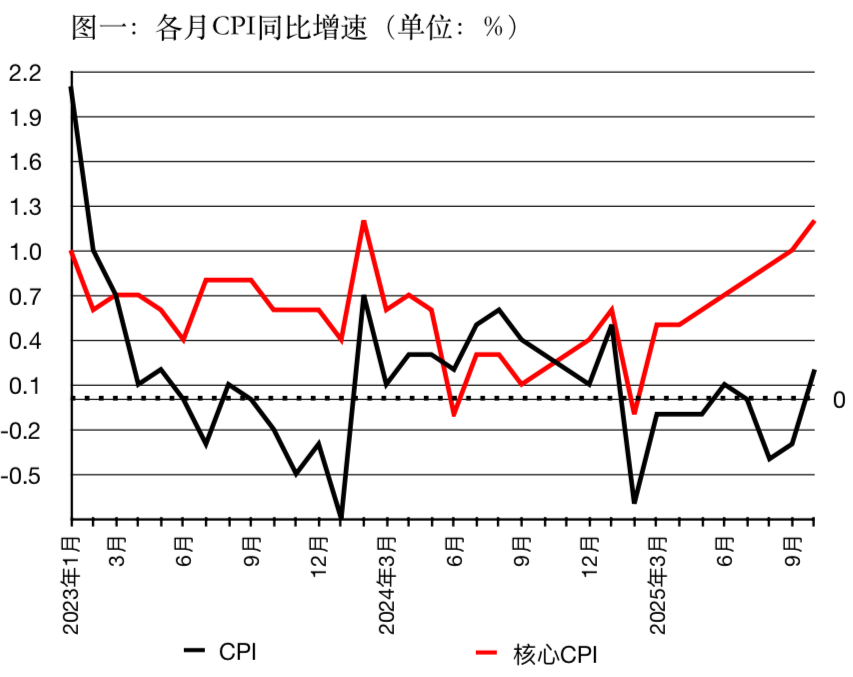 从图一来看,2023年和2025年,CPI同比增速大量时期处于负增长区间。比拟之下,2023年以来中枢CPI仅出现过一次同比负增长,2025年10月中枢CPI更是创下2024年3月以来的新高。